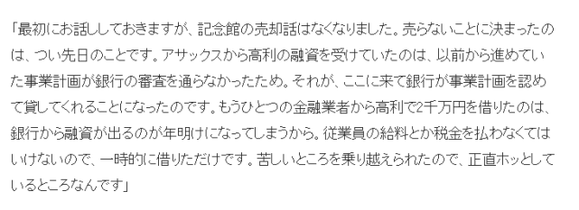 在加藤和也售卖养母故居的舆论风波愈演愈烈的时候,也有媒体特地向加藤和也本人求证。他表示:“我先说一下,出售纪念馆的事已经没有了,决定不卖是前几天的事。之所以会出售是因为之前推进的事业计划没有通过银行的审查。但是现在银行认可了我们的事业计划,决定贷款给我们。我也从另一家金融公司借了2000万日元(约人民币125万元)来支付员工的工资和税金,我克服了困难,所以你们也可以放心了。”