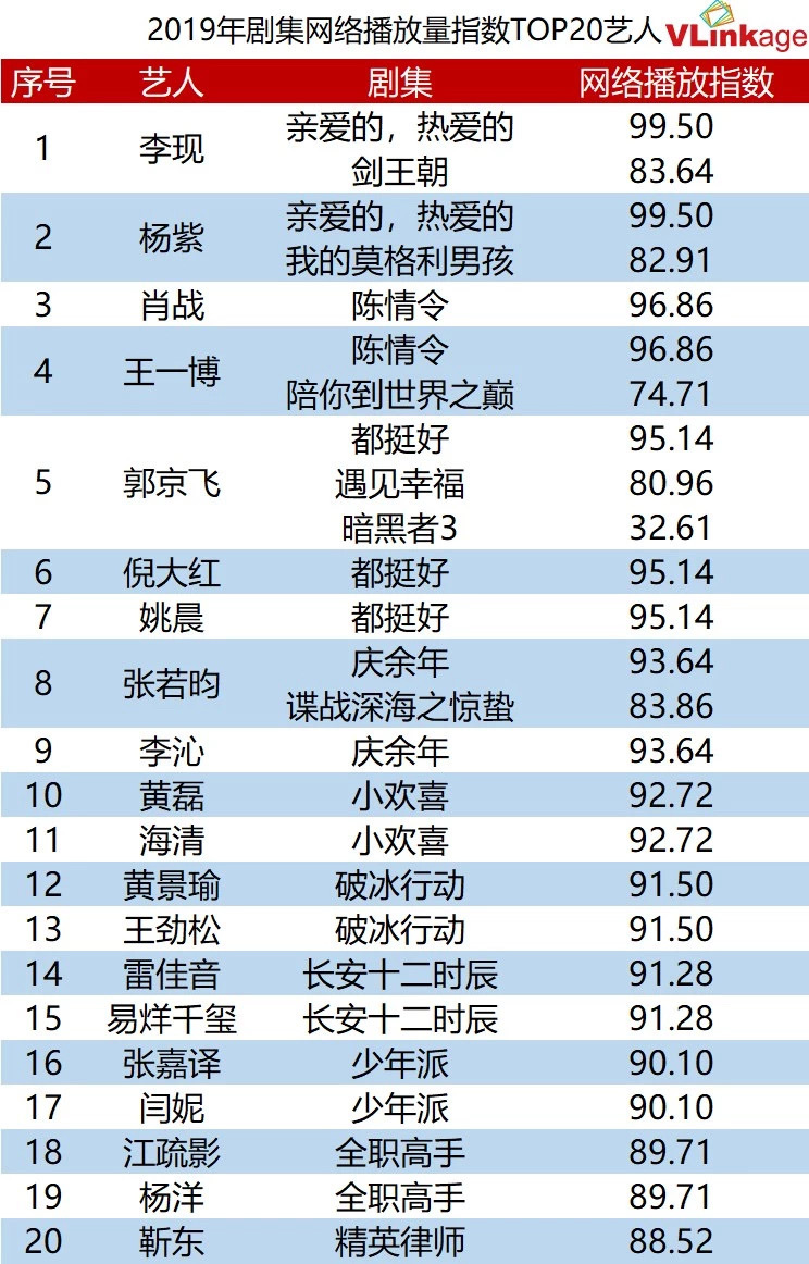近日,某平台发布“2019年剧集网络播放量指数TOP20艺人“榜单,榜单显示演员李现以剧集《亲爱的,热爱的》99.50的网络播放指数和剧集《剑王朝》83.64的网络播放指数居于榜单首