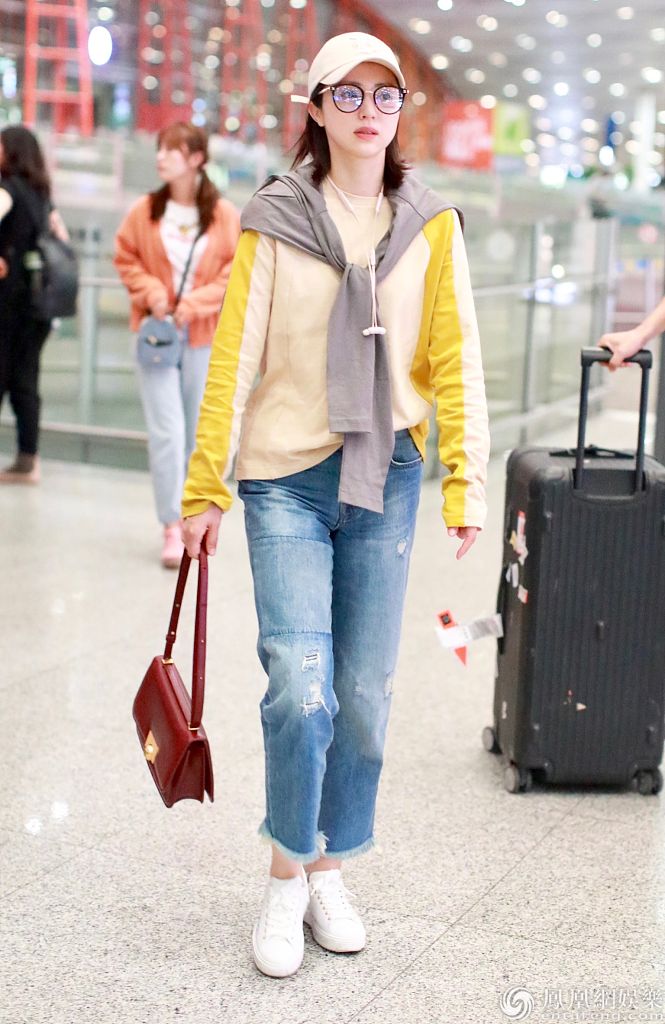 董璇穿休闲牛仔裤搭配T恤,造型时髦。