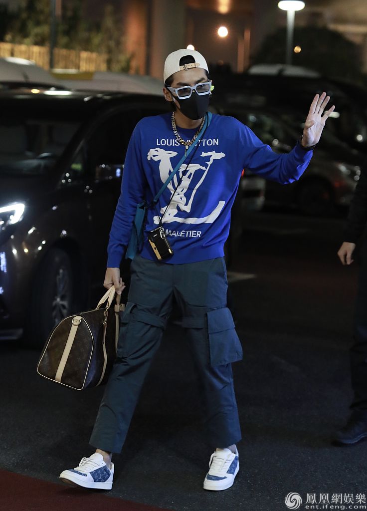 吴亦凡穿着蓝色休闲卫衣前往巴黎看秀。