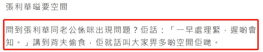 这次张利华深夜被拍到了与老外新欢在车内拥吻,婚外恋情曝光引来不少网友大吃一惊,根据港媒的最新消息,张利华对于是不是同老公感情出现问题做出了回应,表示:“一早就处理过了,之后会通知大家。”讲到“背夫偷食”,她直言希望大家给点空间。