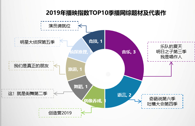 作者 | 周 矗 编辑 | 赵思强 2019年,中国人看了142档季播网综。 春天,我们陪着300个男孩逆风翻盘;夏天,我们跟着喜欢的乐队尽情狂欢;秋天,我们听着脱口秀演员把谐音梗一顿暴讲;冬天,我们和新老演员在梦想之路上努力就位。 综艺,是对生活不同侧面的集中表现与放大。在艺恩智库播映指数前十的网综中,音乐类有三档,语言类有两档,偶像养成、竞技、侦探推理、旅游、舞蹈也都各占据一个席位。 图片来源:2019艺恩文娱数据白皮书 在制造话题,娱乐生活的同时,这些网综也在或多或少地改变着我们的生活:街舞工作室招生火爆,乐队演出一票难求,剧本杀成为聚会必备,脱口秀演员走红全网。 我们选出了六档在2019年,可能改变过我们生活的“神仙网综”。在它们的帮助下,我们拓宽了眼界,发现了美好,顿悟了道理,获得了感动。 每一部综艺,或许都是我们人生某一阶段的侧写。 注:以下节目按播出时间先后顺序排列 《我是唱作人》 音乐不应该有鄙视链 艺恩播映指数:63.1 播放平台:爱奇艺 图源:豆瓣 这不仅仅是一档综艺,还是一次关于“市场需要什么音乐”的大讨论。 原创音乐竞演综艺《我是唱作人》在首发阵容中,把王源、热狗MC Hotdog、毛不易、汪苏泷、梁博、曾轶可、高进、陈意涵Estelle八位风格迥异的唱作人放在了一起。无论他们站在音乐鄙视链的哪一端,都要面对观众最为直接的评判。 用这样残酷的方式,主流音乐观众的喜好或将越发清晰,人们对鄙视链上某一环节的偏见,也变得愈发模糊。 一直被贴上“流量”标签的王源,用一曲《世界上没有真正的感同身受》,娓娓道出了他年少出道的辛酸痛楚,也展现出了在音乐上的才华与抱负;被嘲歌“土”的高进,同样用一首荡气回肠的《西东》,证明了自己在音乐上的多重驾驭性;选秀出身的梁博,更是用他独具一格的创作风格,成为中国唱情歌最动人的男歌手之一。 总导演车澈认为,想要真正地实现音乐多元化讨论,不但要达到“观众和唱作人”的和解,还要达到“唱作人与唱作人”的双重和解。华语原创音乐已经无法回到那个全民只听几首歌的年代,“好歌”的新标准也正在被各类音乐实验定义,但这场讨论永远不只是属于某一群体。 音乐之所以能够带给人快乐,正是在于它的包容。 《这!就是街舞》第二季 “会跳街舞的人也太帅了吧” 艺恩播映指数:71.3 播放平台:优酷 图源:豆瓣 这档节目的火爆证明了,小众圈层类综艺的第二季可以更好看。 2018年,街舞选拔类真人秀《这!就是街舞》第一季爆火,大神选手的同台竞技堪称神仙打架。它不但打破了中国观众对街舞的浅显认知,还让“街舞文化”中的“和平、尊重和爱”走进了主流观众的视野。 正在大家猜测,第二季会不会出现“选手荒”时,《这!就是街舞》第二季给所有的“综二代”打了个样。 在尊重个人风格和街舞文化的同时,第二季节目设计了更为多样的赛制和真人秀环节。观众既能看到battle中的剑拔弩张,又会感受到大神之间的惺惺相惜;既能在采访中领略那些街舞圈的江湖传说,又会在节目中惊喜收获一些“新人怪物”。 它不仅是一档竞技类真人秀,更是一条圈外人了解街舞文化的渠道。对专业观众来说,街舞的魅力是核心力量,是踩点,是技巧。但对“小白观众”来说,街舞文化的感染力和归属感,才是街舞的魅力。 每位喜爱街舞的观众,都会在手机里收藏几条舞蹈视频。一边看,一边不住地感叹,“会跳街舞的人也太帅了吧!”。 《乐队的夏天》: “我们和乐队躁了一整个夏天” 艺恩播映指数:65.6 播放平台:爱奇艺 图源:豆瓣 《乐队的夏天》,让乐队看到了属于自己的“夏天”。 这档节目召集了全国不同风格的31支乐队。在多轮主题竞演中,五支乐队脱颖而出,成为了节目中的HOT5乐队。 然而,排名并不是这档节目的重点。很多一把年纪的乐迷,一边擦着眼泪,一边感谢这档神仙综艺,让九连真人这样的小众乐队有了更大的舞台,让“永远年轻永远热泪盈眶”的态度得到了表达,让乐队的精神得到了前所未有的尊重。 喜欢把人拉黑的新裤子主唱彭磊,更是因为耿直火出了圈,被他拉黑甚至成为了一种“身份的象征”。 因为这档节目,乐队也开始有了“夏天”。节目过后,刺猬乐队的粉丝数从10万+涨到了100万+,Click15的粉丝数怒涨40倍,北京场巡演票“秒光”。太合音乐刘瑾还在三声沙龙上透露,刺猬、Click15的商业价格翻了10倍以上。 喜欢乐队的观众,也一起度过了一个最“躁”的夏天。节目播出之后,有四名员工向爱奇艺高级副总裁陈宏嘉提了离职,原因是他们看完《乐队的夏天》后,也想像乐队那样“追一把梦”。沈黎晖自己都没想到,一档音乐综艺,把他这个“滚圈老炮”看得泪流满面。 那些和乐队一起躁动的日子,就是我们的青春啊。 《脱口秀大会》第二季 “全国人都学会了谐音梗” 艺恩播映指数:56.2 播放平台:腾讯视频 图源:豆瓣 脱口秀就是吐槽明星?《脱口秀大会》第二季说“NO!”。 比起《吐槽大会》,《脱口秀大会》更专注于脱口秀本身。在第二季中,每期一个主题,脱口秀演员现场投票排位的赛制,让更多观众领略了脱离明星之外,脱口秀本身的魅力。 除了大家熟悉的李诞池子,《脱口秀大会》第二季还带火了许多新面孔:“一顿暴擦”卡姆,“东北金融魔头”呼兰,“动次打次”张博洋,“追星车间女工”赵晓卉。这也是脱口秀节目