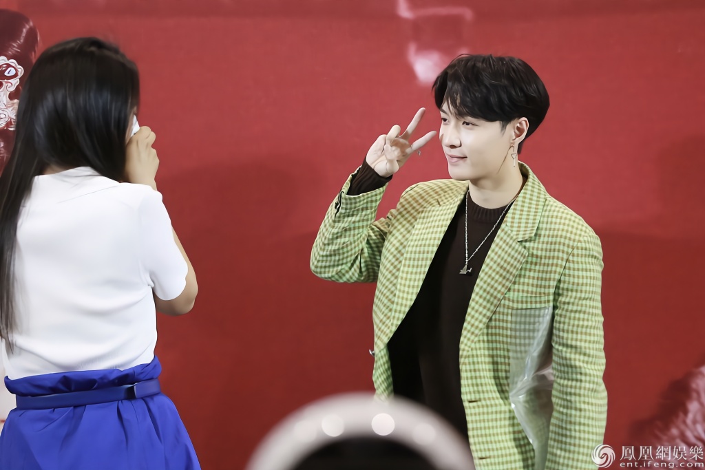 张艺兴穿绿色西装,比耶卖萌可爱呆萌。