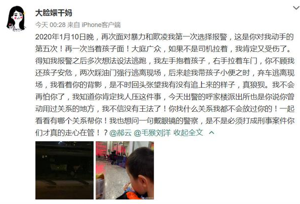据悉,1月11日凌晨,王珊珊发文痛斥控诉郝云家暴:“这是你对我动手的第五次!再一次当着孩子面!”但当时有媒体向郝云经纪人求证,对方表示:“根本不存在的事,清者自清。”