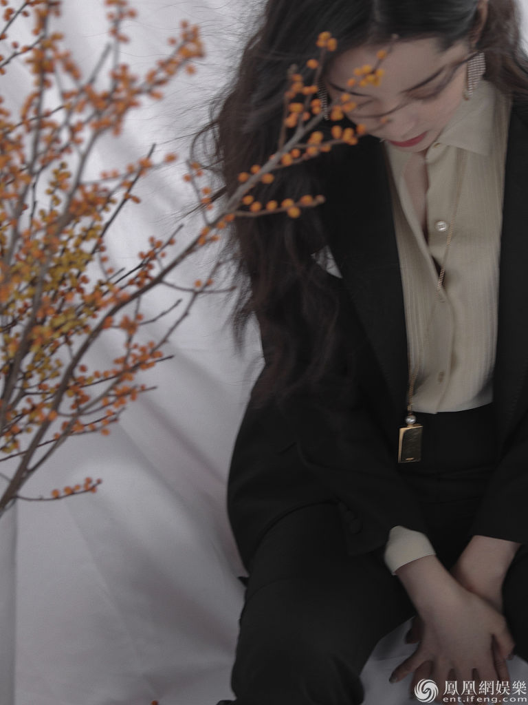 欧阳娜娜身穿黑色西服套装搭配咖啡色衬衫,演绎OL风职场范儿。