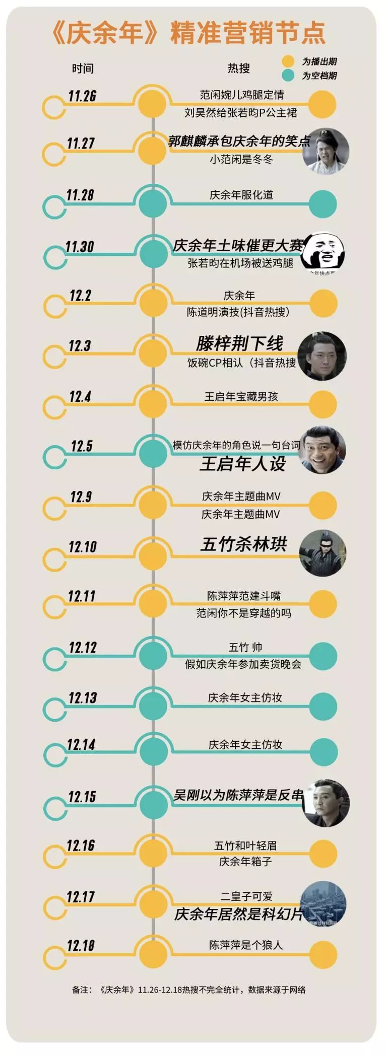 观察《庆余年》从播出到收官的营销动作,娱子酱发现本剧的营销节点可以以天为单位进行计算,并且做下了剧集播出前中后期的完整规划。