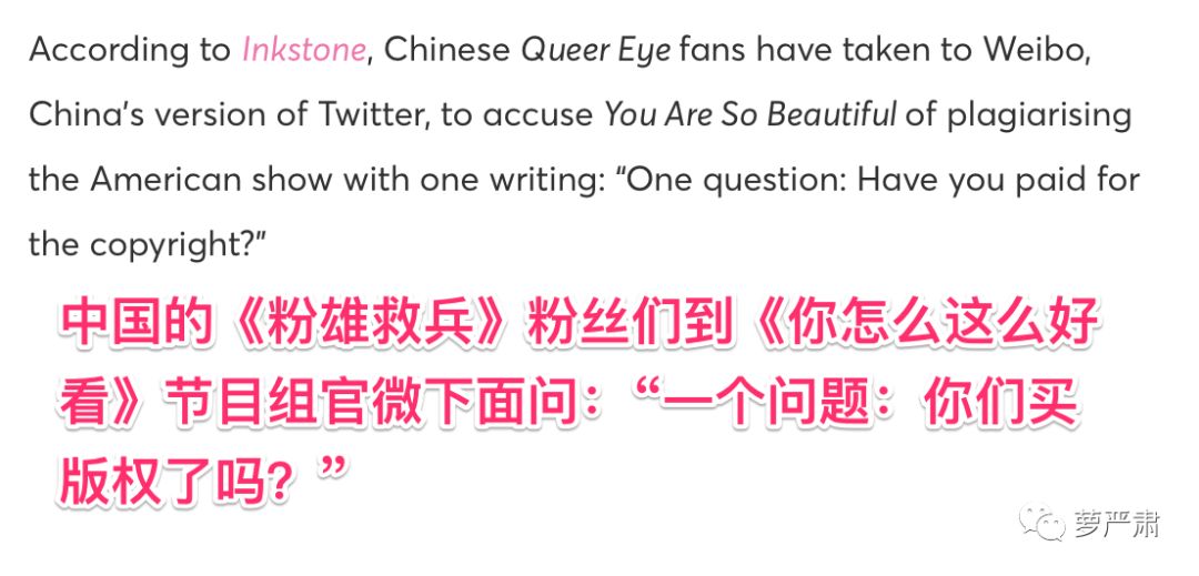 Bobby Berk转发的那篇文章里还有其他对于中国版节目的意见,主要是翻译了中文网络上的批评声音:疑似没有购买版权、节目进一步强化偏见、加深对女性的刻板印象。