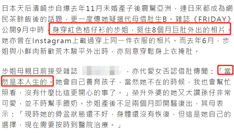 近日滨崎步的妈妈接受媒体的采访,她否认了女儿是借肚生子:“当然是本人生的,她会自己养育孩子,当然她不在的时候,我也会帮忙照看,没有什么比这更开心的事了。”荣升为外婆的滨崎步妈妈大赞外孙可爱,也不时帮忙喂奶。