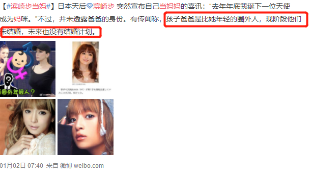 本月初,滨崎步突然宣布自己当妈妈的喜讯,不过她并未暴露孩子爸爸的身份还表示自己没有结婚,未来也没有结婚的计划。有传闻称,孩子爸爸是比她年轻的圈外人。