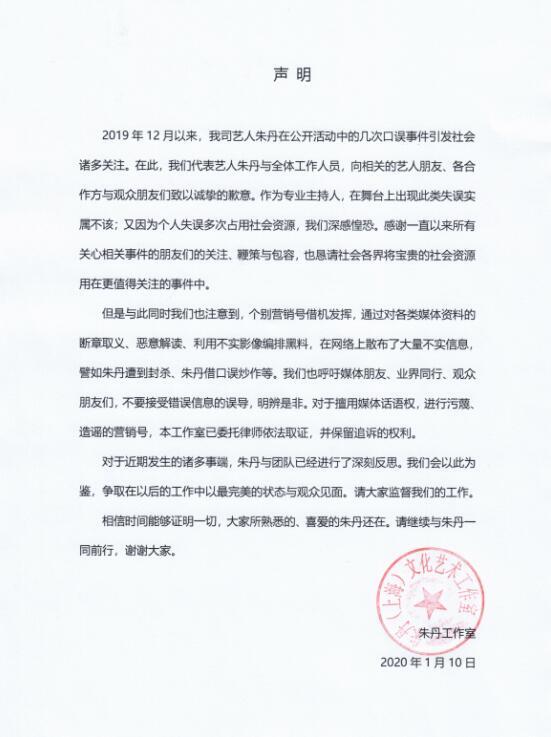 日前,朱丹多次在主持活动时出现的“口误”事件引在网上引起热议,众多网友吐槽,这不是一个专业女主持的应有水平。1月10日,朱丹工作室发表声明,对于几次活动中的口误引发大家关注的事件表达歉意,感谢大家的关心和鞭策。同时也表示对于个别营销号借机发挥,断章取义、恶意解读、散布不实信息的行为,律师已依法取证,并保留追诉权