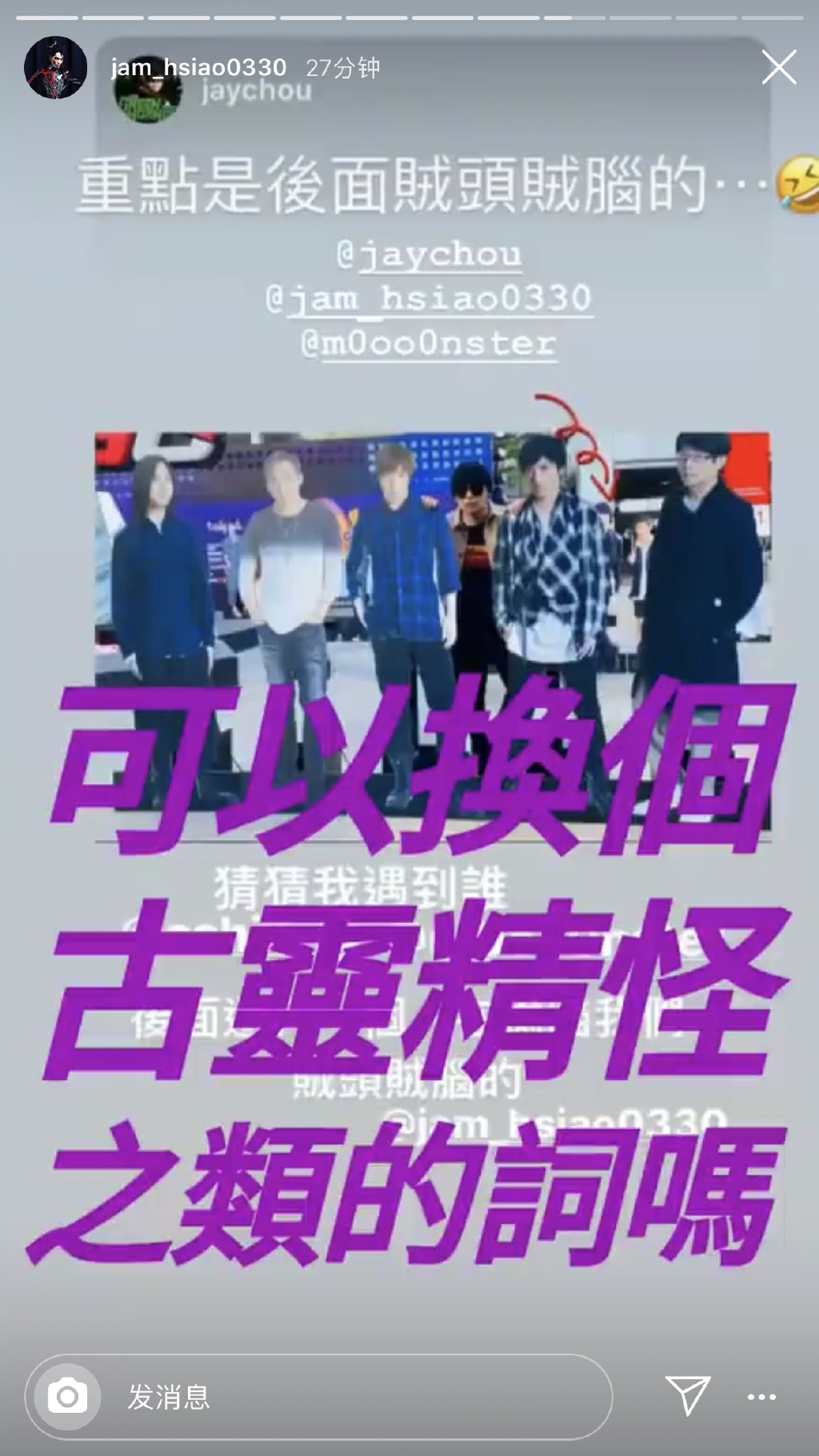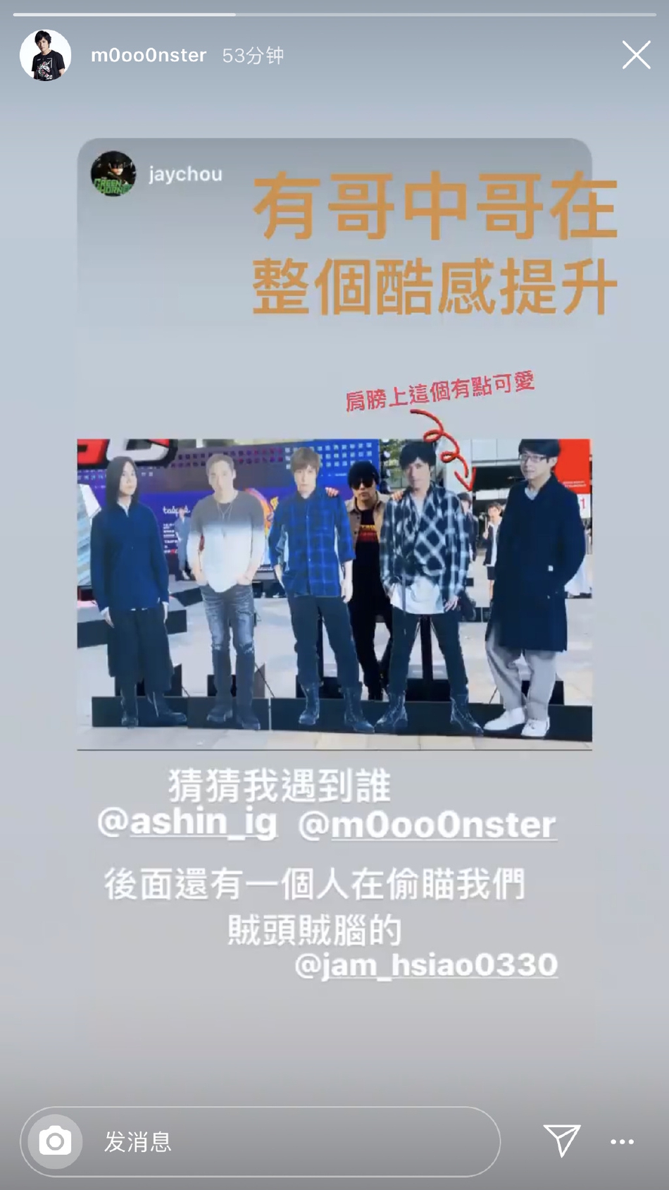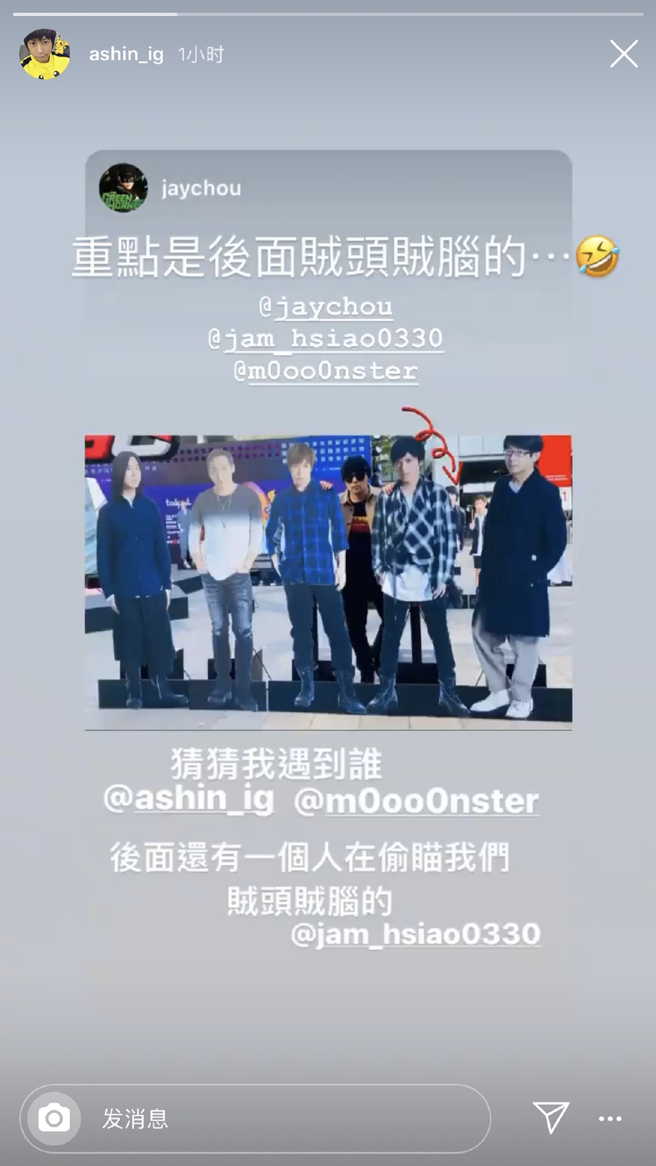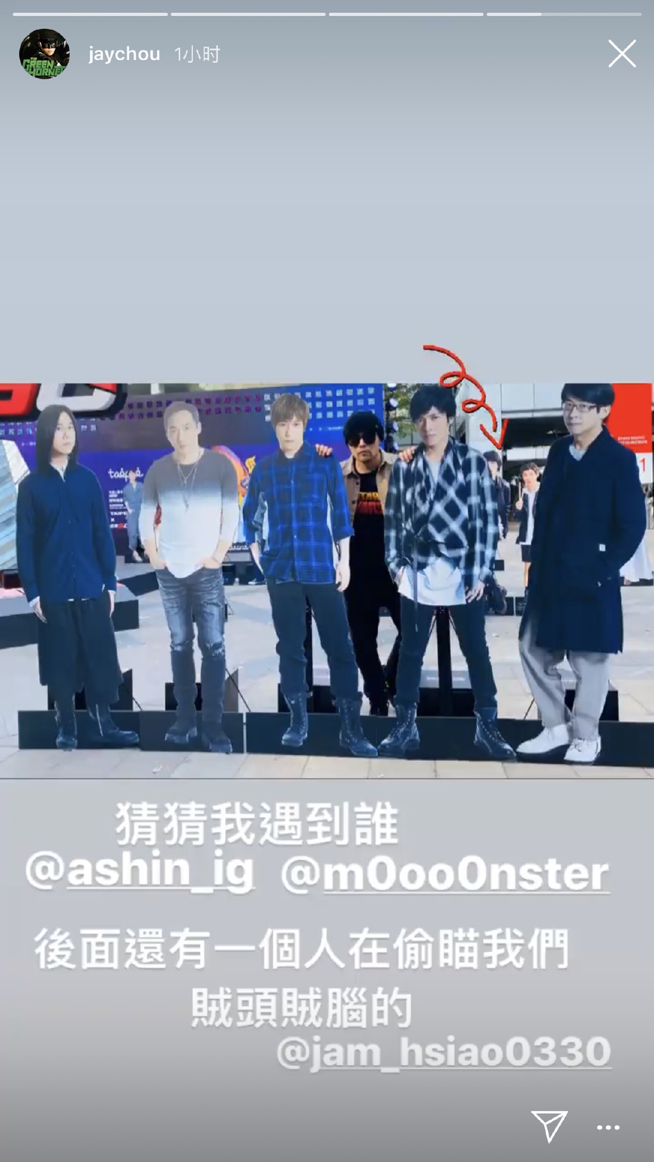 1月9日,周杰伦在个人社交网站晒出与五月天人形立牌合影的照片,并配文:“后面还有一个人在偷瞄我们,贼头贼脑的@萧敬腾。”随后五月天阿信、怪兽、萧敬腾转发动