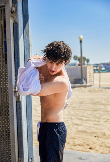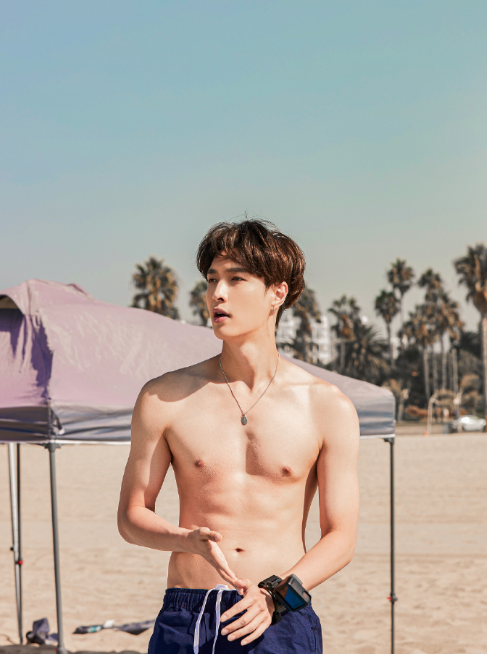 照片中,张艺兴只穿着泳裤,赤裸上身秀出腹肌。