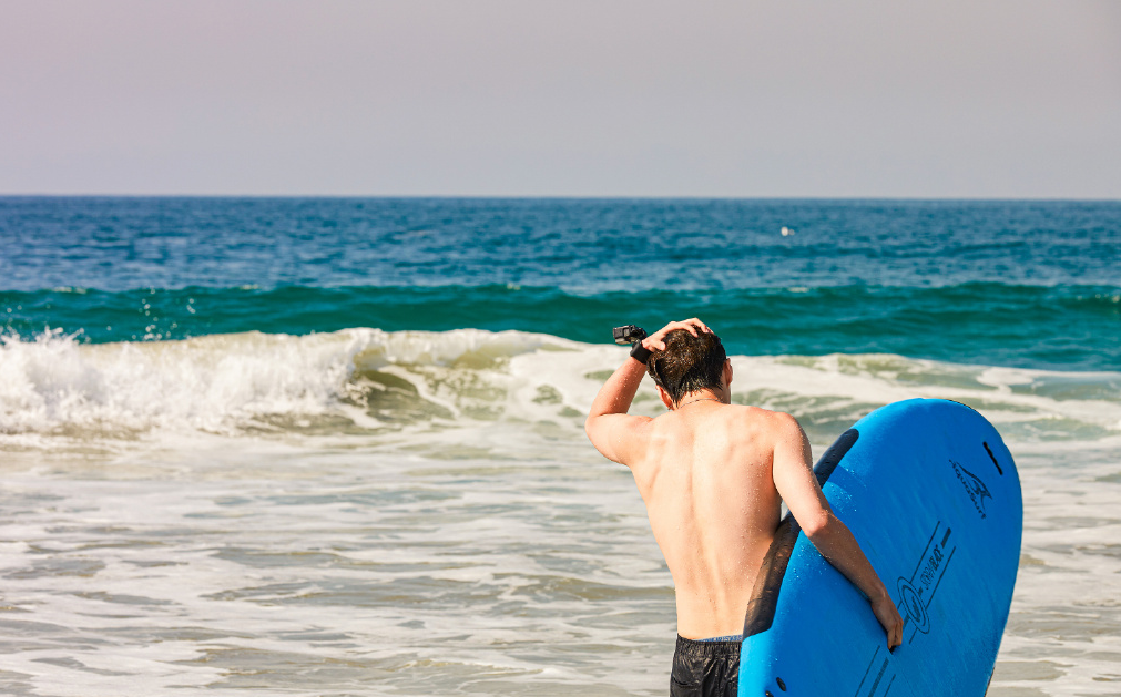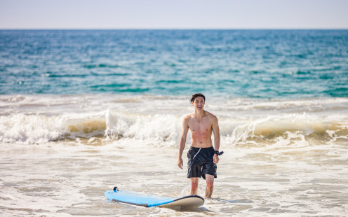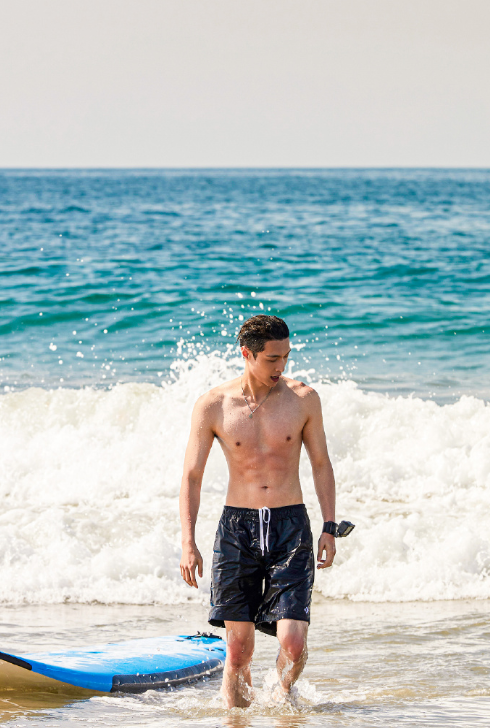 张艺兴抱着冲浪板在海浪间穿行,帅气炫酷。