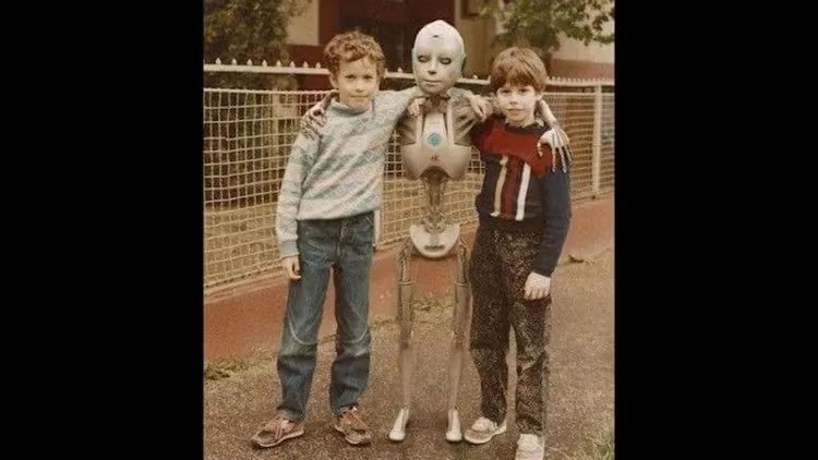 ▲天才儿童的童年玩伴也异于常人。 马斯克(右)和好朋友搂抱着他们共同的玩具兼好朋友——一个骷髅形状的机器人。