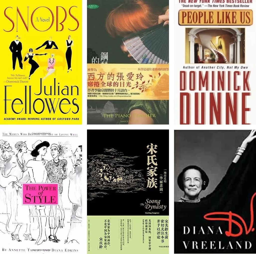 ▲《势利小人 SNOBS》作者:朱利安·菲罗斯、《钢琴教师的情人》作者:Lee,JaniceY.K、《像我们这样的人PEOPLE LIKE US 》作者:多明尼克 邓恩、《风格的力量 THE POWER OF STYLE》作者:Annette Tapert , Diana Edkins、《宋氏家族:一场历史的华丽悲剧》、《D.V》 作者:戴安娜·弗里兰。