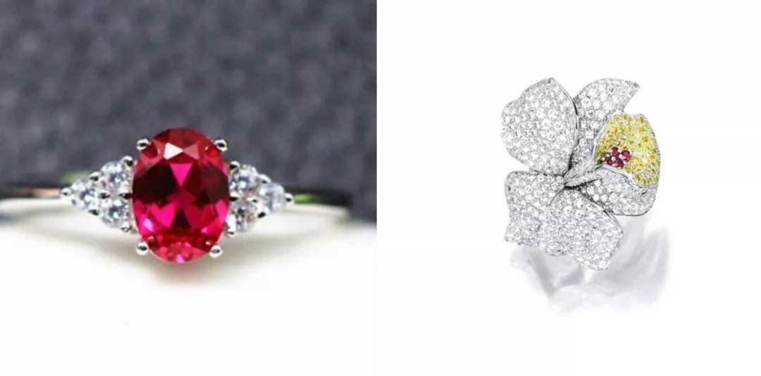 ▲东方珠宝也是香港历史比较久的珠宝品牌,左图的红宝石戒指为类似款式。右图的兰花胸针出自比较著名卡地亚Cartier,这一枚黄色钻石配钻石及红宝石的兰花胸针在2016年苏富比春季拍卖会,估价为九万五至十六万。