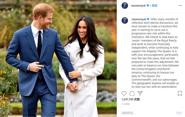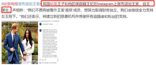 1月9日,英国哈里王子和他的美国籍王妃梅根在社交平台上宣布退出王室,自主谋生。声明称:“我们不愿再被看作王室‘高级’成员,想努力取得财务独立,我们会继续全力支持女王陛下。”他们还表示,将建立新的慈善机构并感谢所有追随者和粉丝的支持。