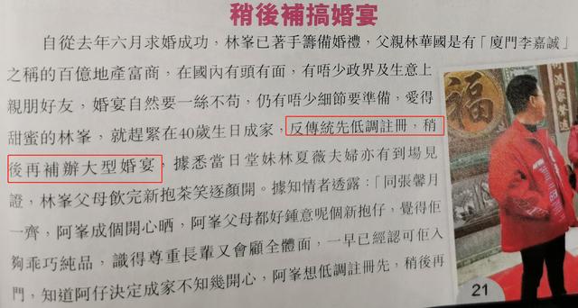 据悉林峯在去年12月8日,他的40岁生日当天,已经正式和张馨月领证结婚,成为夫妇。12月17日,张馨月在社交平台上晒出性感美照,当时左手无名指上已经戴有结婚戒指,幸福感爆棚。