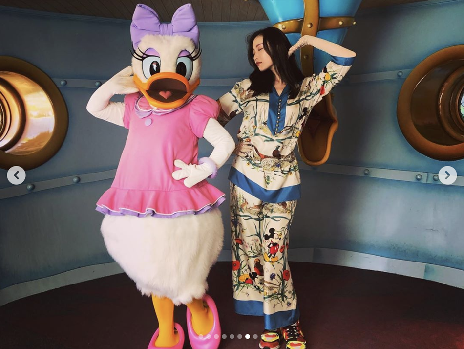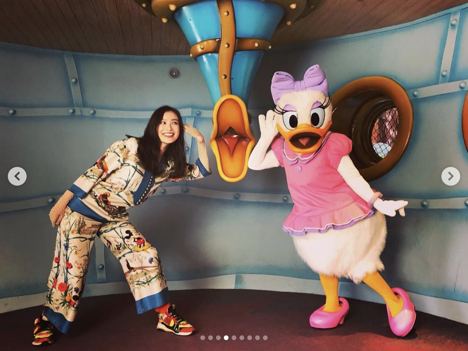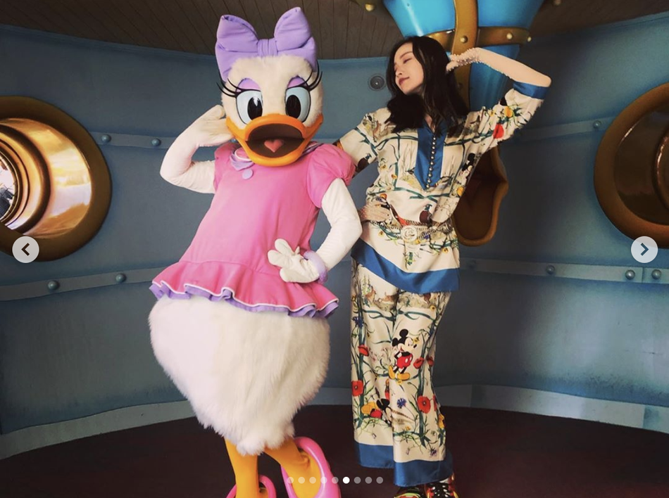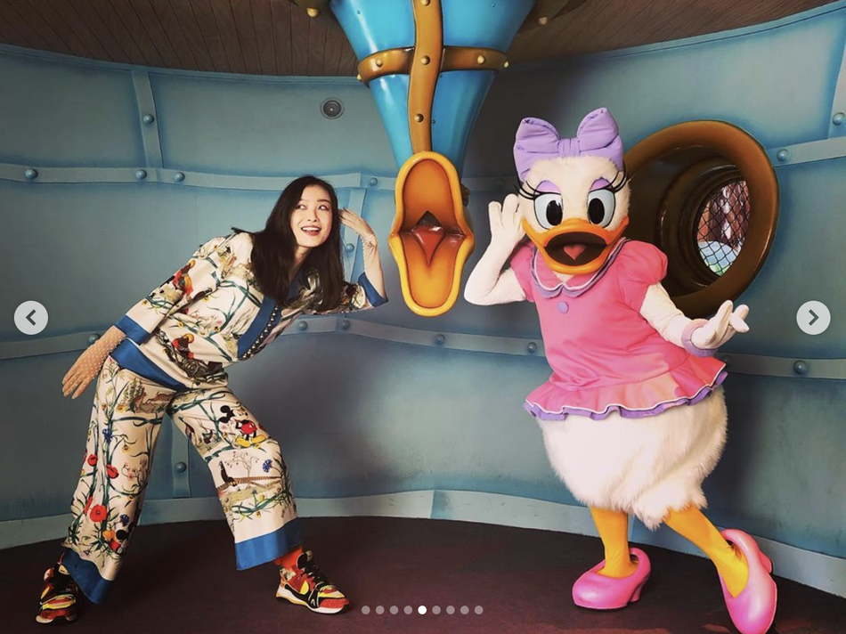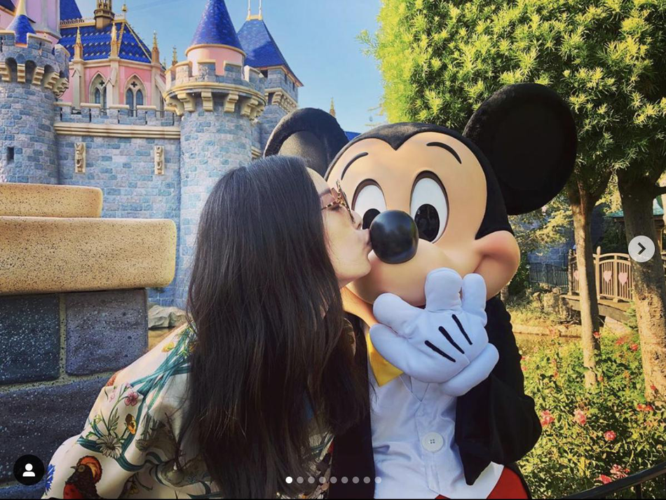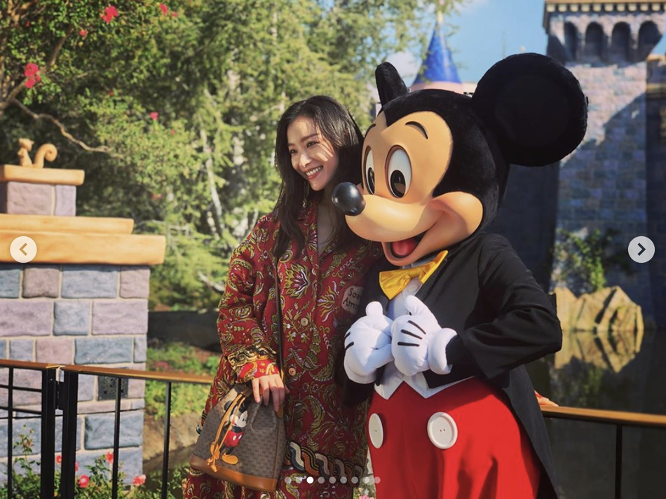 照片里她换了好几套很有民族风的服装,与迪士尼的卡通人物亲密互动,笑容明媚,少女感满满。