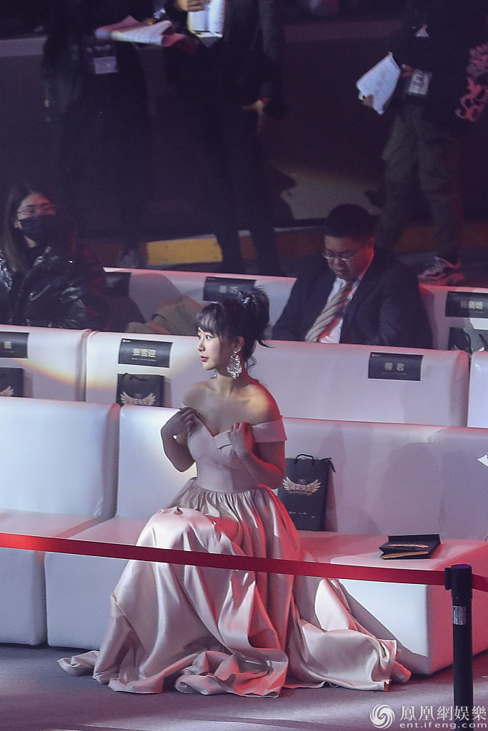 关晓彤披着围肩保暖。