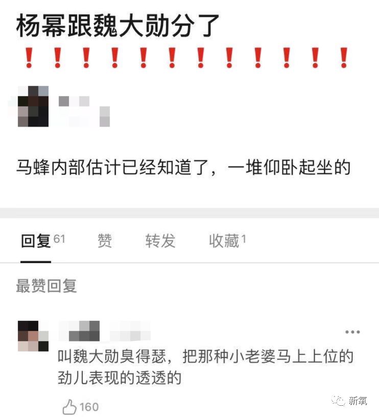 恰巧这两天有消息爆出杨幂因不满魏大勋拿恋情炒作,已于近日与其秘密分手的消息。