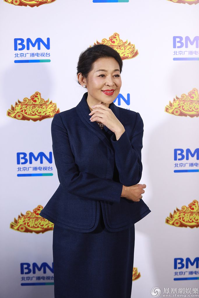 倪萍身穿蓝色套装腰身纤细。