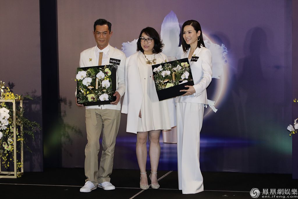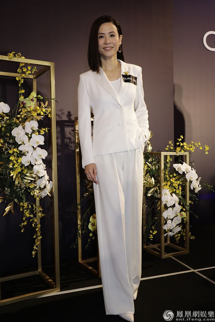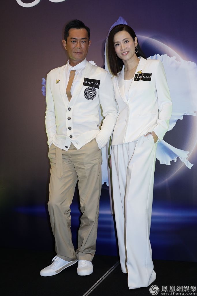2020年1月8日,香港,古天乐、宣萱出席GUERLAIN新品发布会。两人都穿着白色的西装,看上去CP感爆棚。在发布会上互动合影非常默