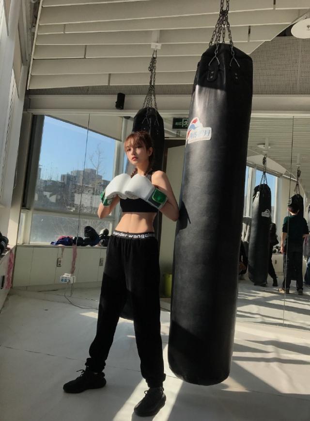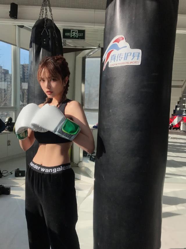 周扬青戴着拳套摆pose,蚂蚁腰、马甲线、大长腿吸足眼球,身材赞爆了。