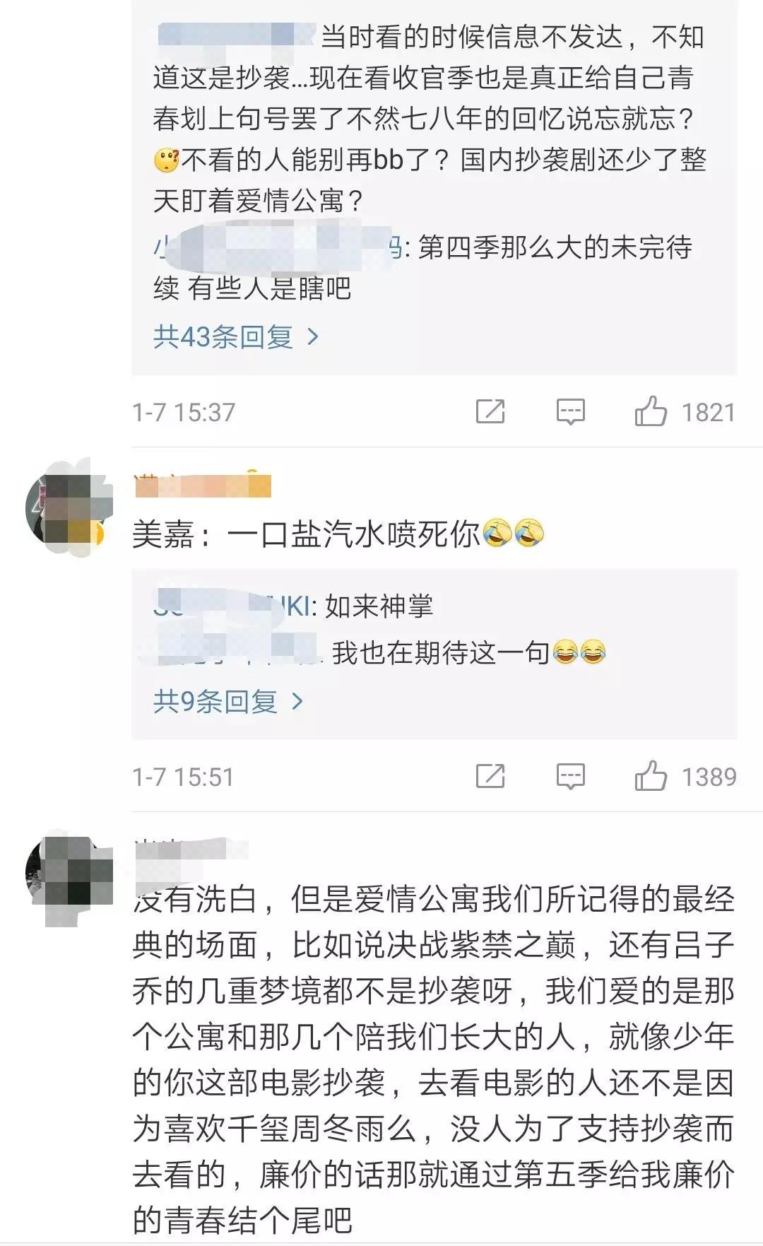 一方网友认为爱情公寓之所以不再有续集,就是因为没得抄了才完结的,并且质疑《爱情公寓》粉丝的青春太廉价了,抄袭剧都能当青春?