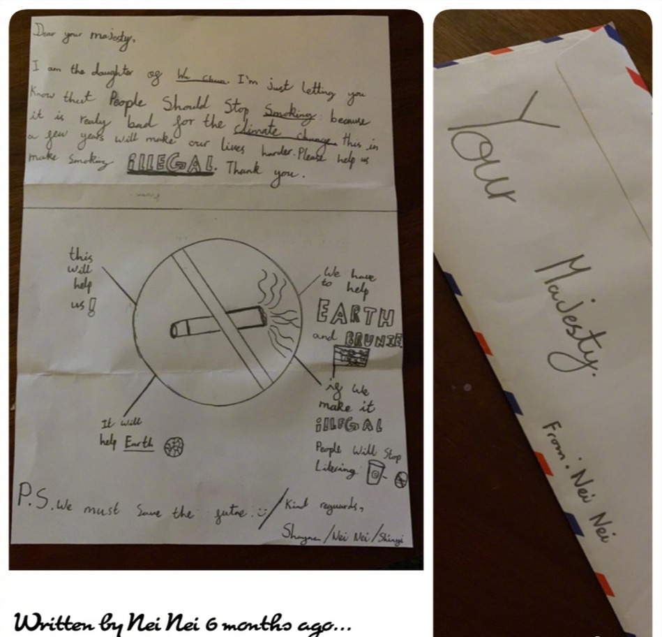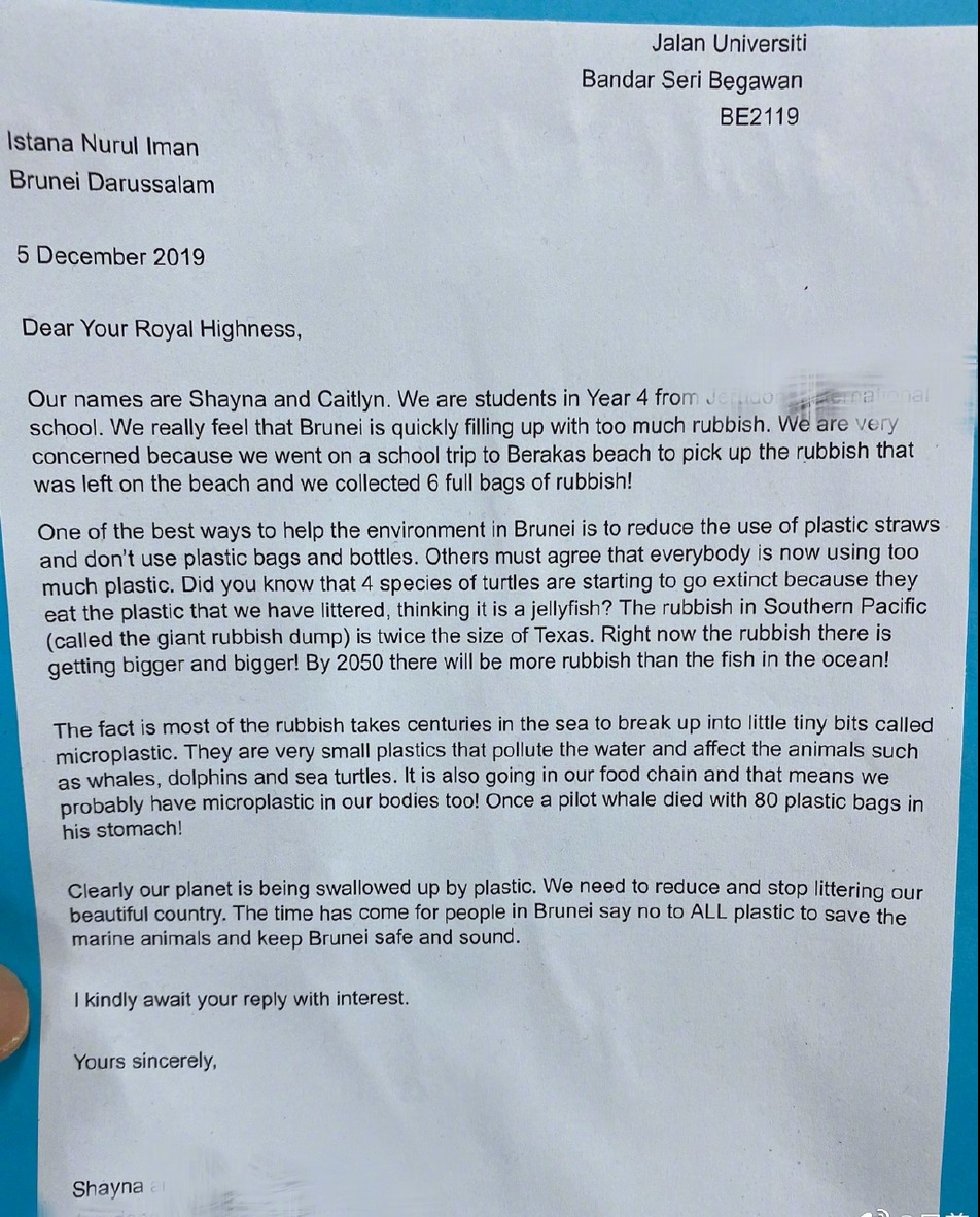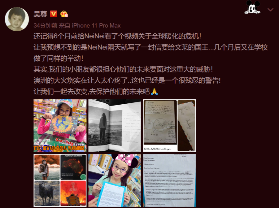 1月8日,吴尊发文:“还记得6个月前给NeiNei看了个视频关于全球暖化的危机!让我预想不到的是NeiNei隔天就写了一封信要给文莱的国王...几个月后又在学校做了同样的举动