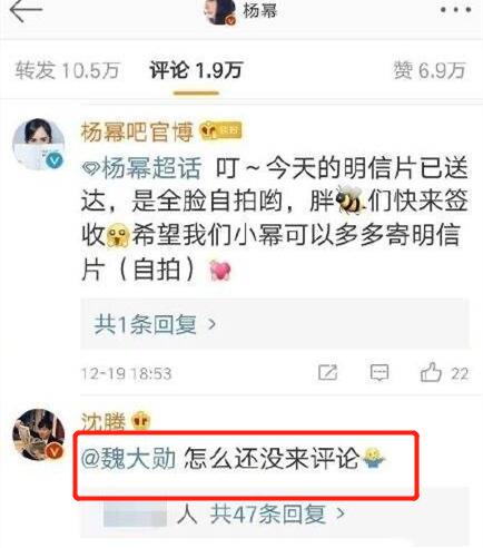 魏大勋频繁骚操作,引发杨幂方和她粉丝的不满,结果弄巧成拙惹怒杨幂斩断情丝分手。而魏大勋的粉丝却表示他们俩人从来没有在一起过,恋情本身就是假的,男神也不需要炒作,你们觉得俩人到底有没有在一起过呢?如果没有,圈内同事沈腾这条评论又是怎么回事呢?