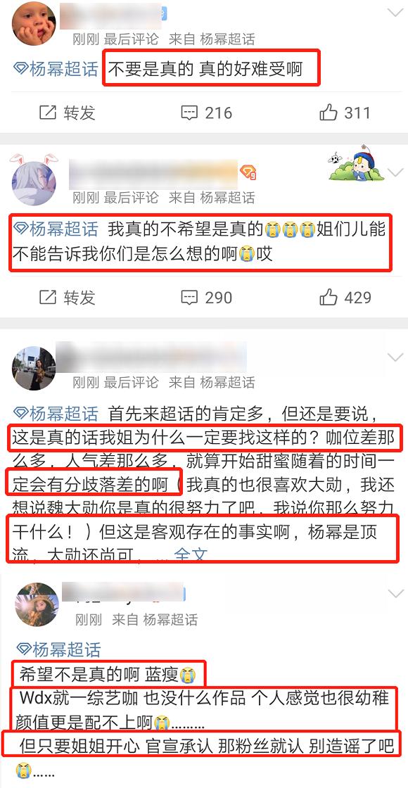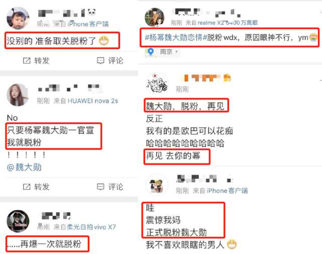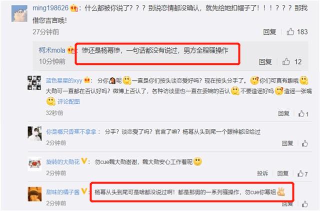 俩人疑似分手的消息一曝光,杨幂的粉丝纷纷表示:“惨还是杨幂惨,从头到尾一句话没说,全都是男方的一系列操作暗示,打擦边球。”而魏大勋的粉丝也不甘示弱,留言大骂:“没在一起何来分手!”