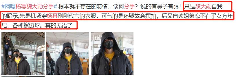 之后魏大勋和杨幂多个情侣服饰被扒,而且杨幂方前脚公布最新代言写真,随后魏大勋就穿着同系列毛衣现身机场,甚至半脱外套大方摆拍,引起热议后,魏大勋在下飞机前脱掉了毛衣,有“此地无银三百两”的感觉。