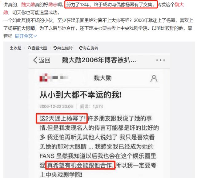 接下去魏大勋出道前在博客中多次提及喜欢杨幂的动态也被曝光,网友纷纷感慨,魏大勋的人生真是励志,为了女神下定决心减肥,考取中戏,进入娱乐圈,努力了13年,终于站到了杨幂的身边。