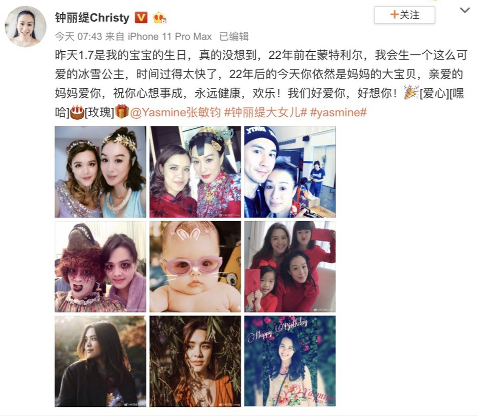 钟丽缇配文:“昨天1.7是我的宝宝的生日,真的没想到,22年前在蒙特利尔,我会生一个这么可爱的冰雪公主,时间过得太快了,22年后的今天你依然是妈妈的大宝贝,亲爱的妈妈爱你,祝你心想事成,永远健康,欢乐!我们好爱你,好想你!”