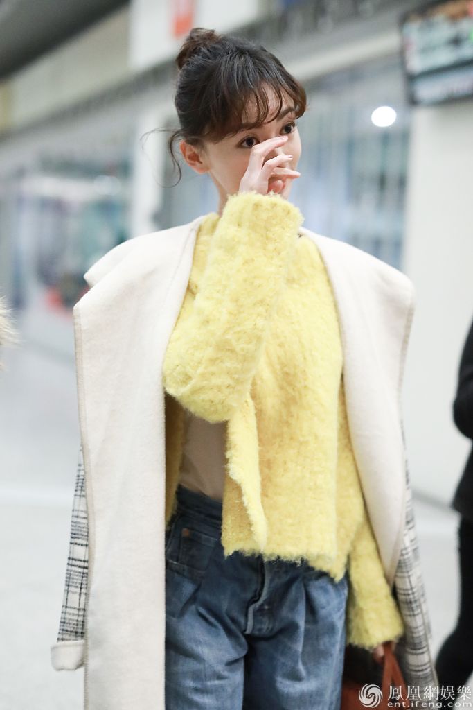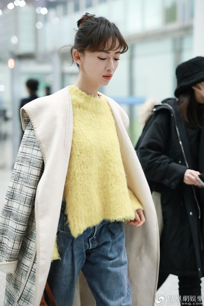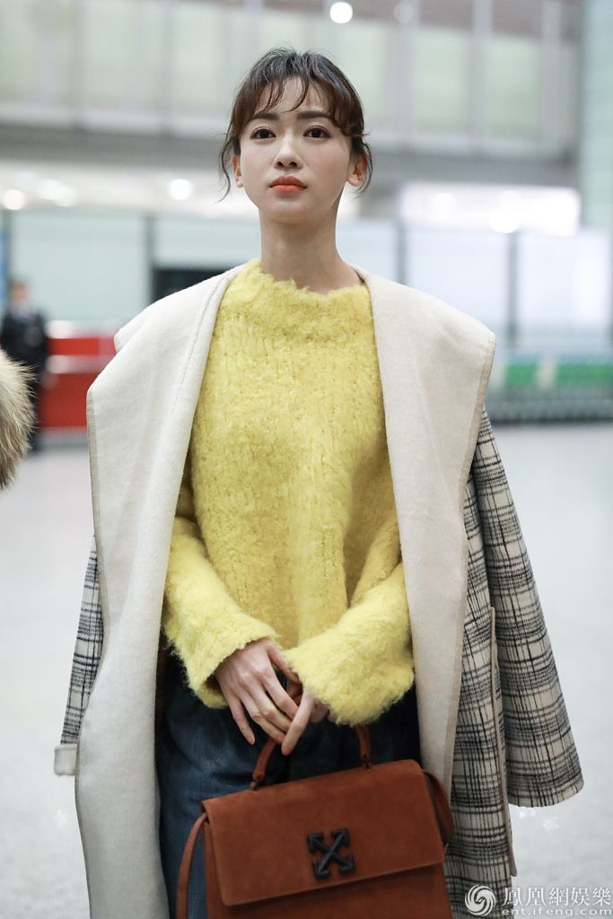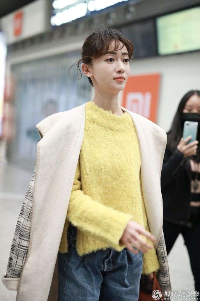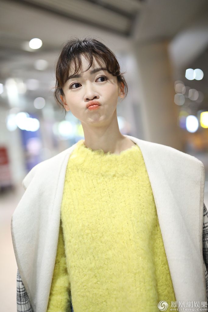 她扎尾辫梳卷刘海青春减龄,穿黄色毛衣外搭格子大衣清新动人,嘟嘴卖萌可爱满分。
