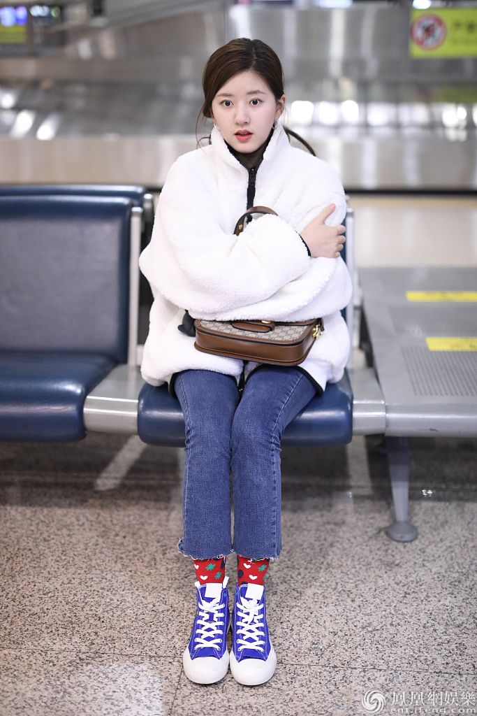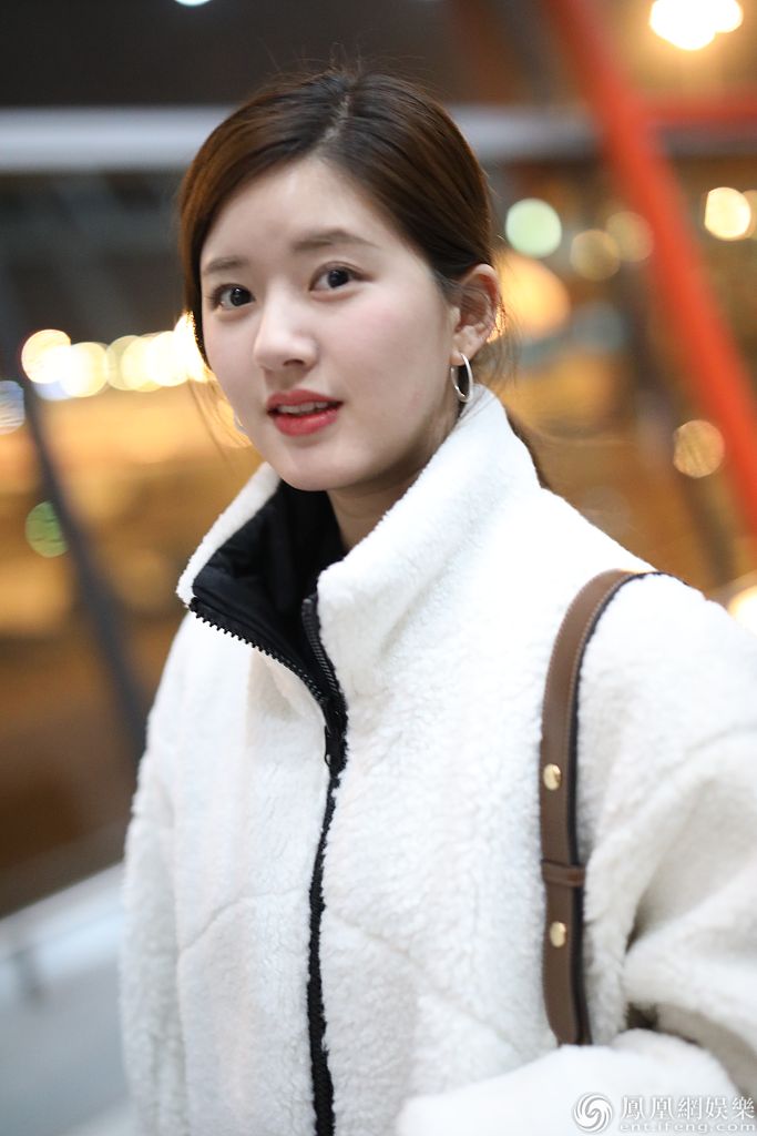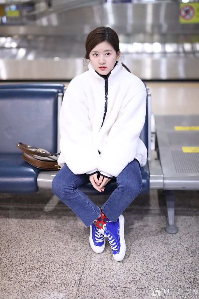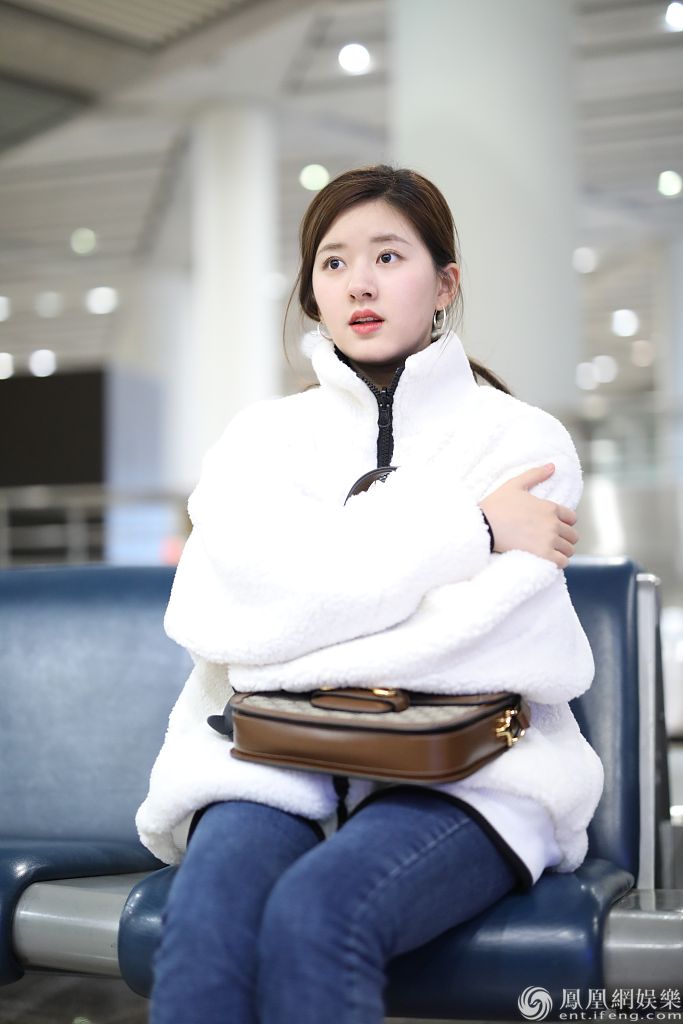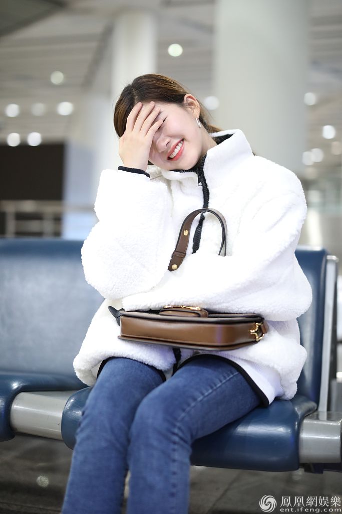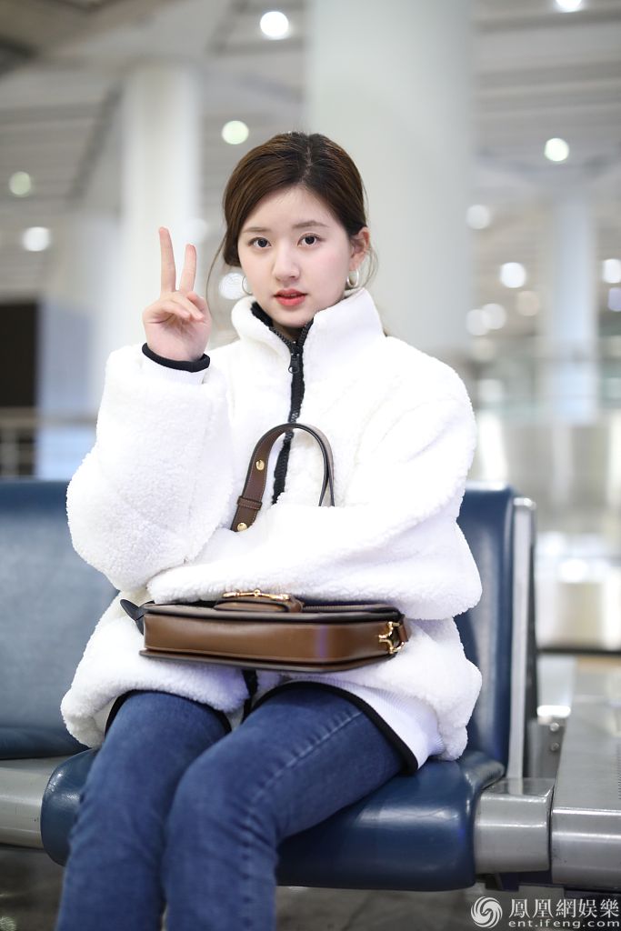 她凌晨现身机场坐姿乖巧,身穿白色毛绒衣对镜比剪刀手,表情呆萌十分可爱。