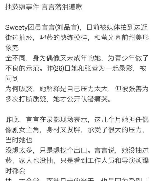 这段恋爱谈的,是伤人伤己。刘品言当时还是少女偶像,又是谈恋爱,又是被拍到在街边抽烟,除了上节目痛哭道歉,刘品言就读的高中也记了她小过,成为第一位因抽烟被记过的学生艺人。