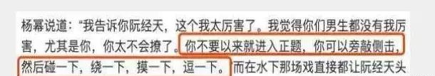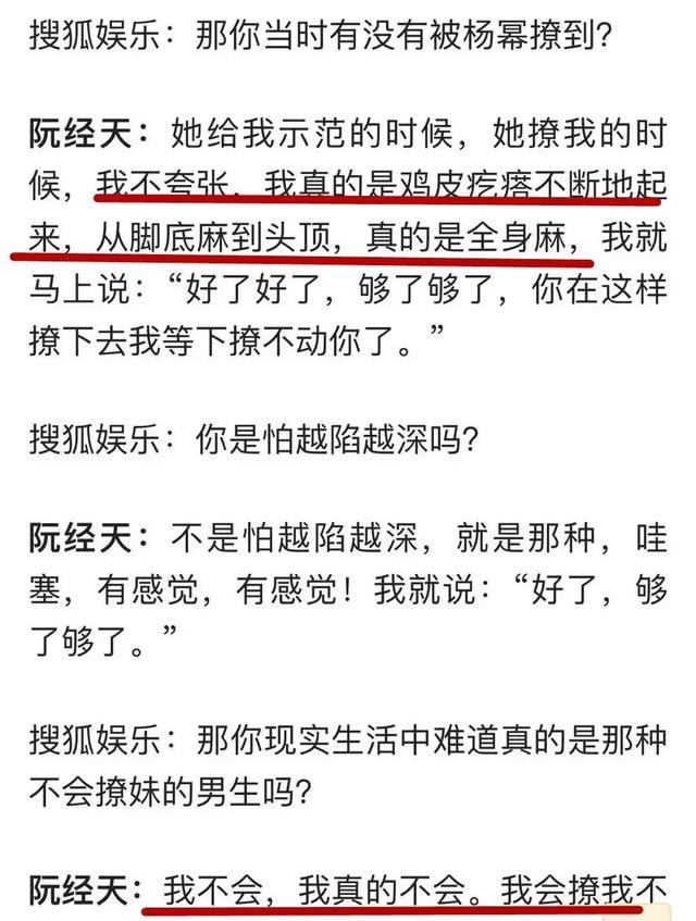杨幂传授给阮经天“四个一下”,分别是碰一下,绕一下,摸一下,逗一下。阮经天表示,被杨幂撩的时候他整个头皮都发麻,只得赶紧让她停手,怕自己越陷越深。