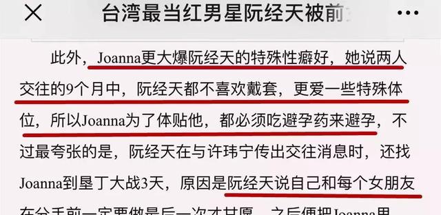 最夸张的是,据Joanna爆料称,阮经天在与许玮甯传出交往消息时,还找Joanna到垦丁大战3天。原因是阮经天说自己和每个女朋友在分手前一定要做最后一次才甘愿,之后便把Joanna甩了。