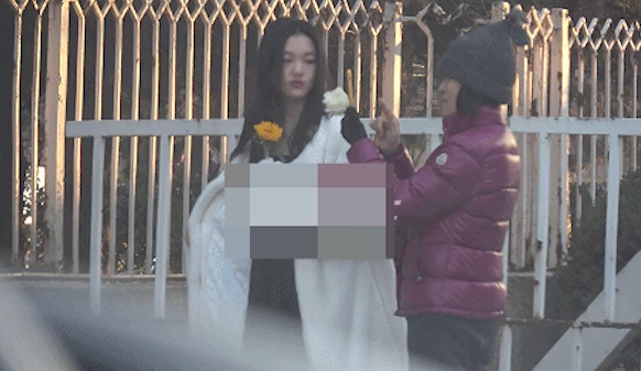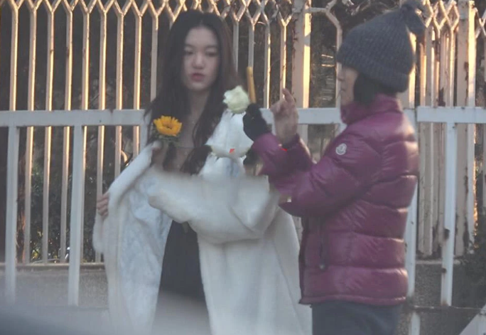 脱下外套的李嫣仅穿着一件黑色吊带裙,手拿鲜花,随意变换pose,十分潇洒不怕冻。