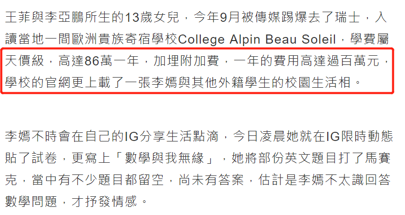 李嫣就读的是瑞士知名的贵族学校,学费更是属于天价的级别,光是学费就高达86万一年,再加上各种附加费,所以一年的硬性开支就已经超过了百万。