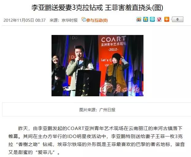 有一次,李亚鹏带头举办了个青年艺术现场活动。为了提高这个活动的人气,他把王菲叫来现场秀恩爱,弄得她特别尴尬。新闻通稿里还说王菲这是害羞得直挠头。