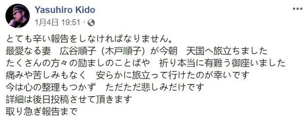 木户泰弘宣布妻子去世消息
