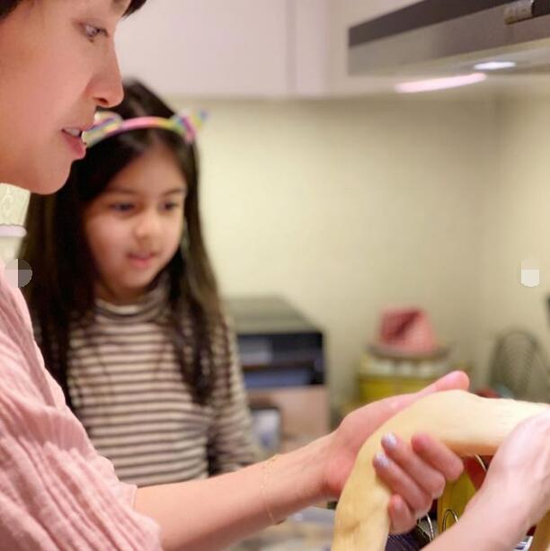梁咏琪之前也有过几段刻骨铭心的恋情,不过最后在2011年,她选择嫁给西班牙老公Sergio,2015年生下女儿索菲亚,小公主已经四岁多了,戴着可爱的发箍,留着长发,大眼萌妹一枚。梁咏琪手里托着做好的面包,非常满足的冲着镜头笑。对面拍照的一定就是Sergio,在老公镜头下,梁咏琪也是贤惠又漂亮。