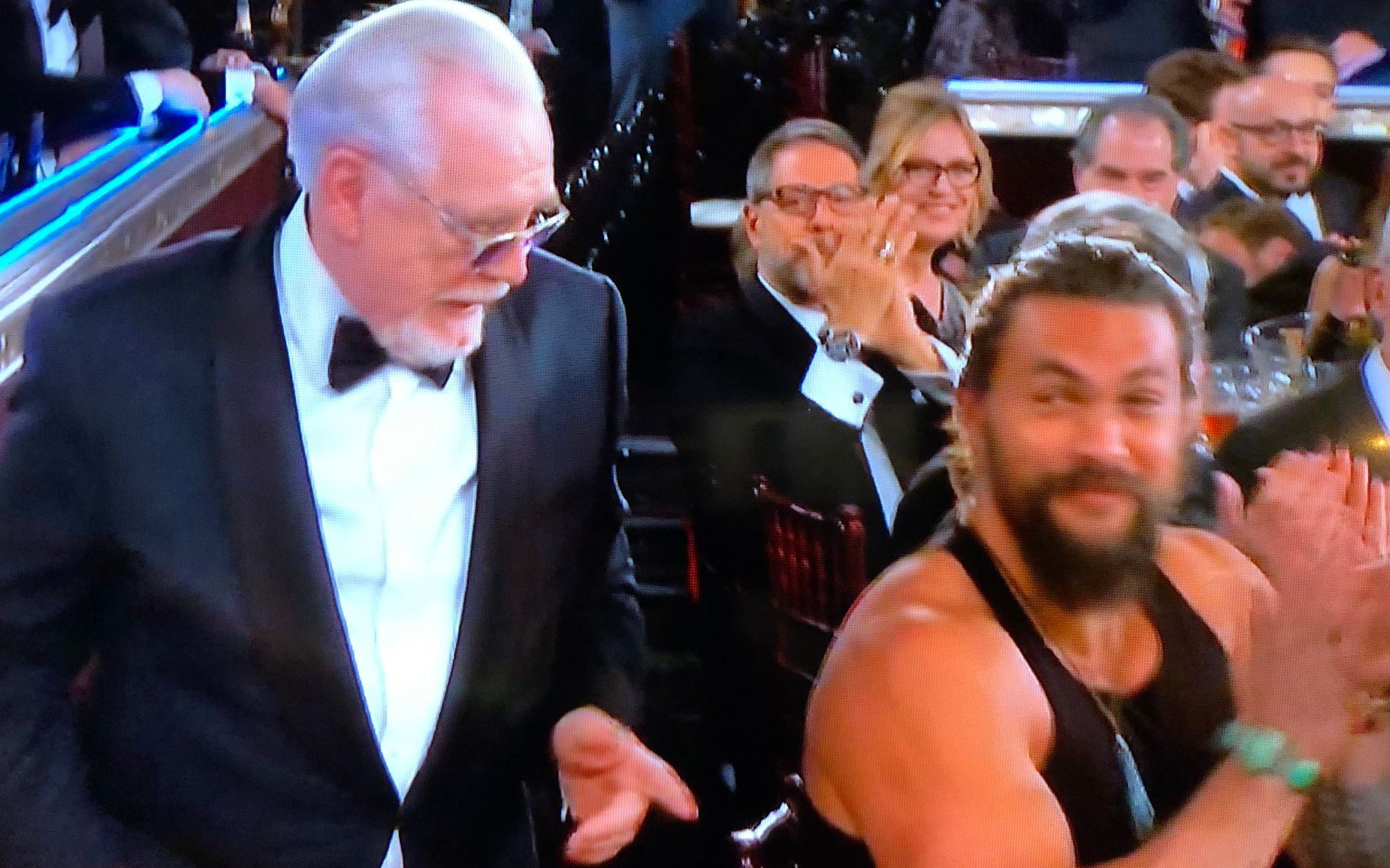 “海王”的扮演者杰森·莫玛作为颁奖嘉宾今年首次亮相金球奖。此前,网络上曝光了杰森为金球奖“精心打扮”的视频,视频中杰森身着蓝绿色绒面礼服,由工作人员帮忙整理装饰;杰森则兴奋地甩动自己长而卷的头发。然而颁奖典礼上,当镜头拍到台下落座的杰森时,他不仅将头发扎了起来,西服也不见踪影,身上只穿着一件黑色背心,露出结实的肌肉。该一晃而过的镜头也成为今年金球奖最有趣的画面之一。
