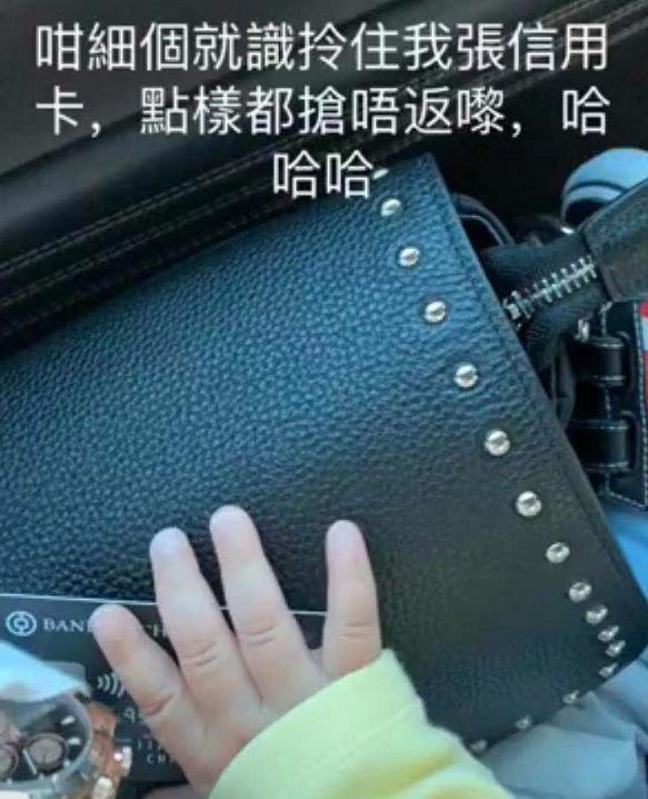 张柏芝晒出的照片中还是没有露出小王子的正脸,但好歹有他部分真容。其中有一张是小王子伸出小手正抚摸张柏芝的黑色钱包,张柏芝配文表示:这么点个就能拿住她的信用卡,一点都抢不回。
