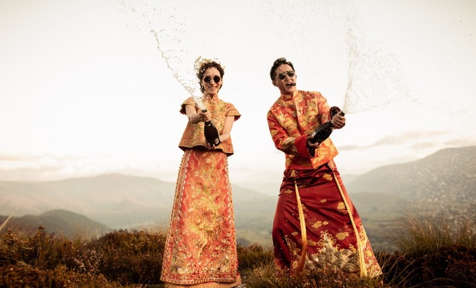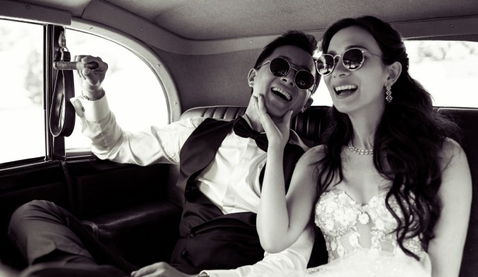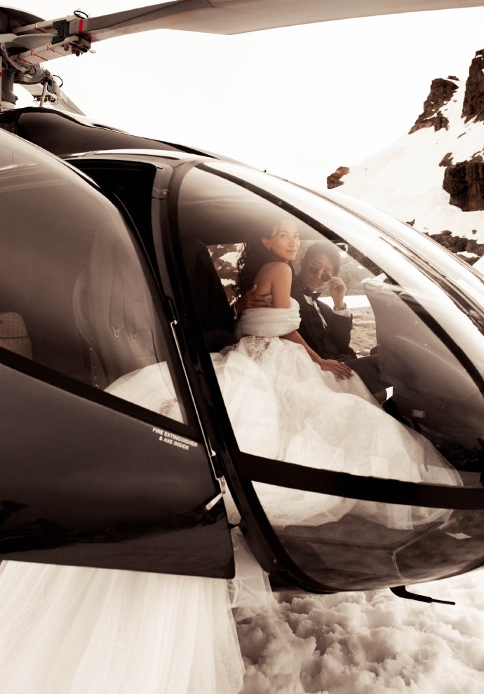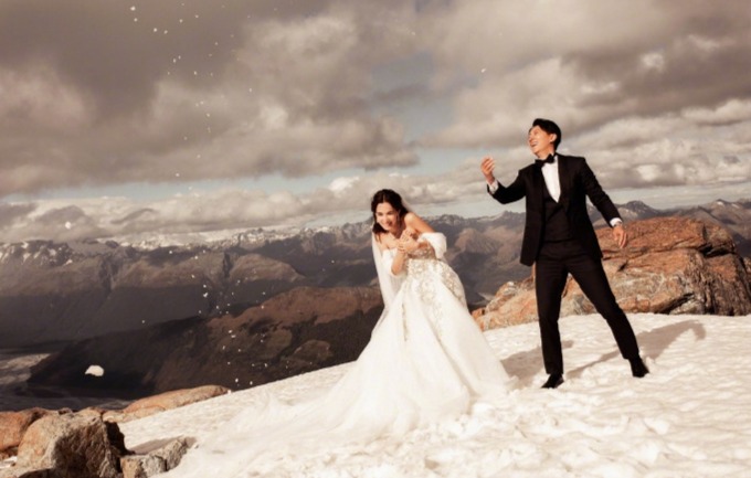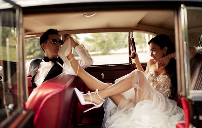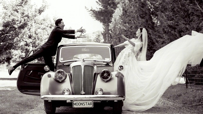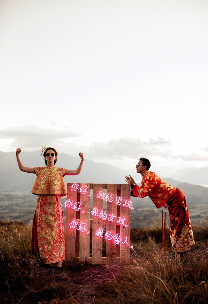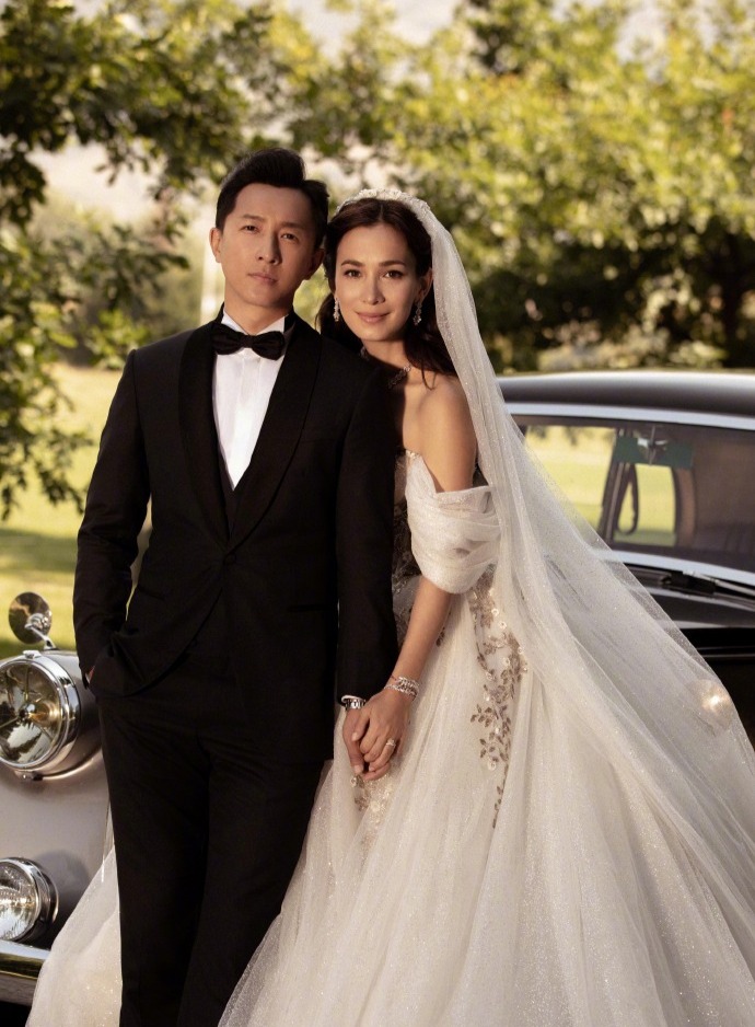 韩庚卢靖姗分享复古风婚纱大片。