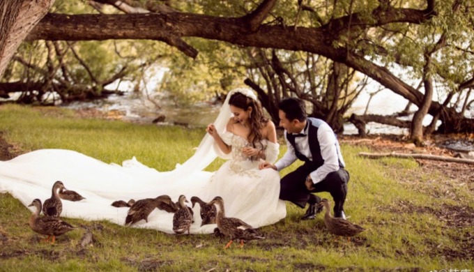 照片中的卢靖姗身穿复古白色婚纱,优雅高贵,两人的装扮十分养眼,在美丽的自然背景衬托下完美如画。