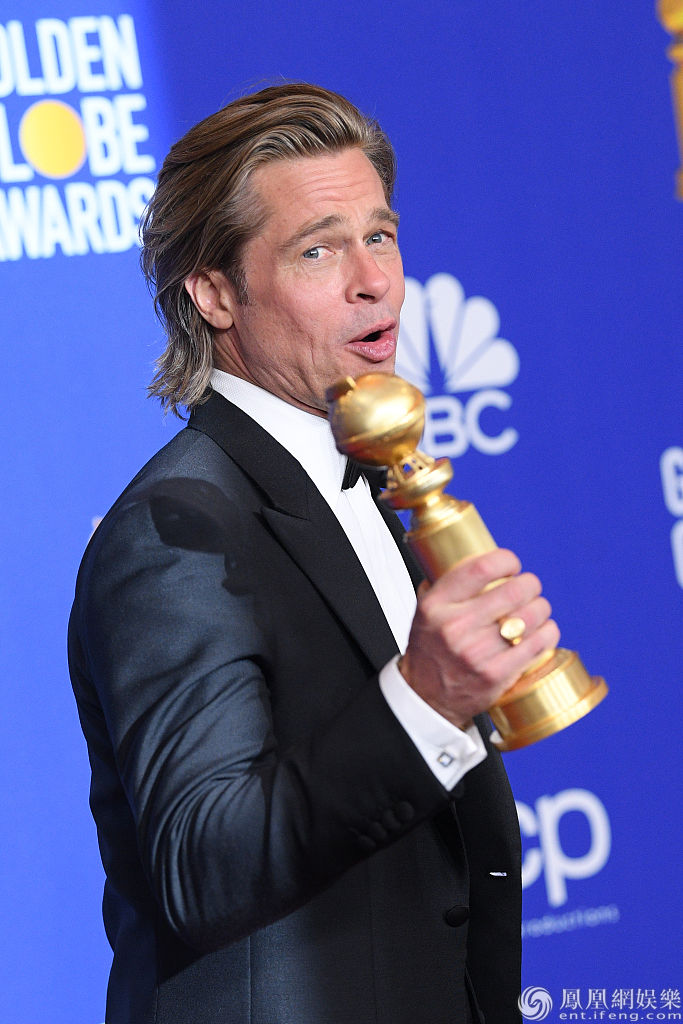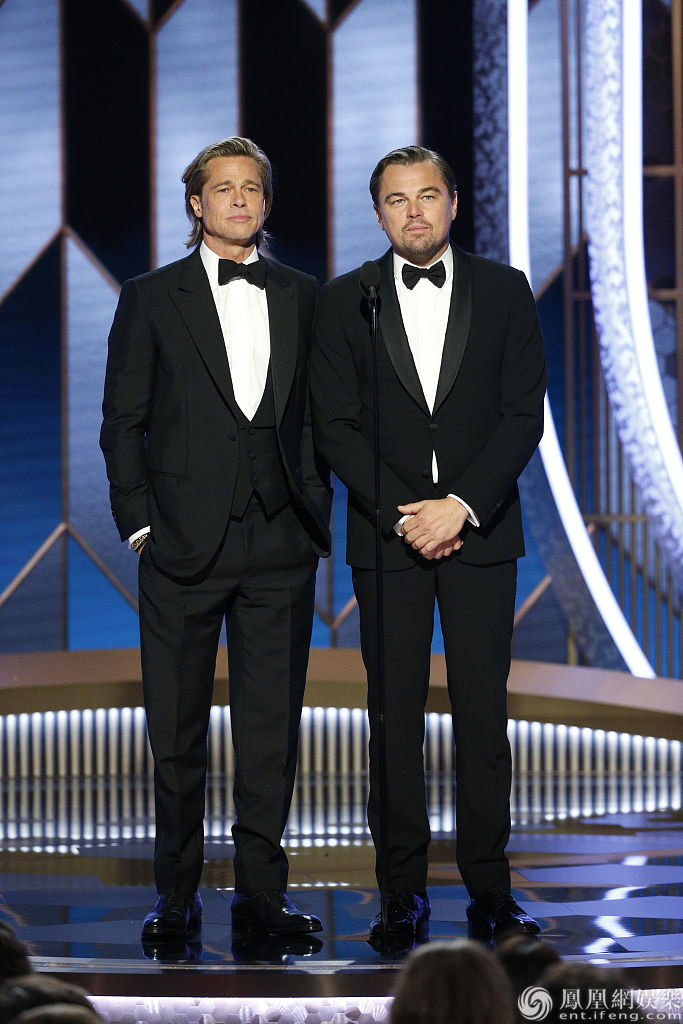 当地时间2020年1月5日,美国加利福尼亚,皮特和小李子合体亮相第77届金球奖后台。值得一提的是,当天皮特与两位前任同场出席活